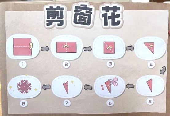 為了滿(mǎn)足孩子們的需求,我們提供了剪紙步驟示意圖,引導(dǎo)幼兒觀察與嘗試。