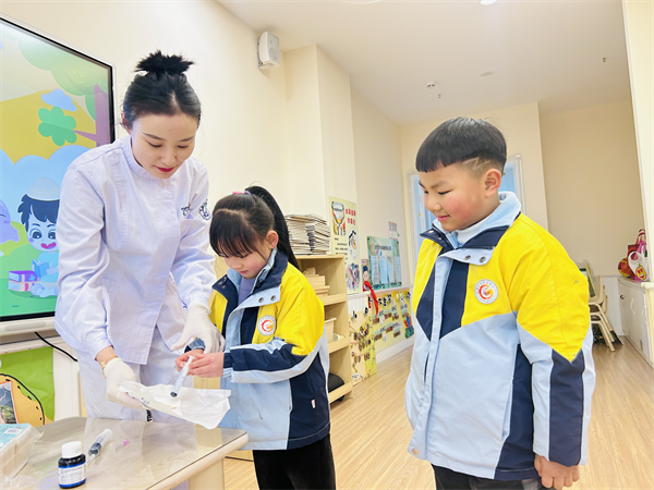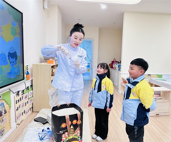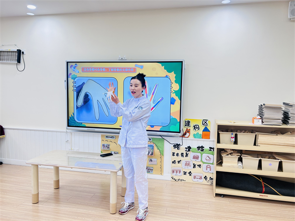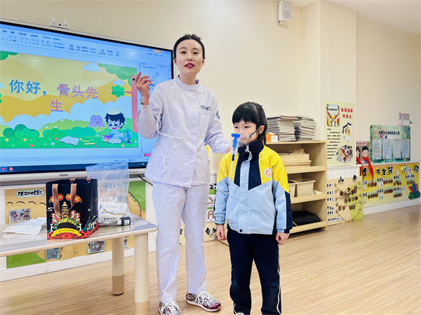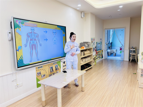 徐藝文媽媽從“人體里為什么會(huì)長(zhǎng)骨頭”為切入點(diǎn),并向孩子們展示常用的醫(yī)療用品,通過生動(dòng)有趣的視頻引導(dǎo)孩子們了解人體中的骨骼組成以及骨骼與身體各部位之間的關(guān)系。以情境化、游戲化的教育方式引導(dǎo)孩子及時(shí)關(guān)注自身的身體健康。