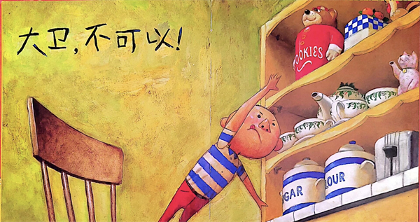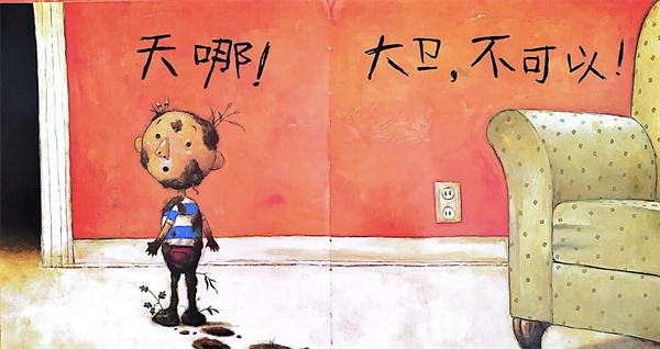 這個天真無邪、把家里搞得一團糟的小男孩,讓大家覺得又開心又釋懷,世界上哪一個幼兒不渴望像大衛(wèi)一樣隨心所欲地在墻壁上亂寫亂畫、把浴室變成一個沼澤地、頭戴鐵鍋敲得叮當亂響,最后大衛(wèi)被媽媽緊緊地摟在懷里,幸福地閉上了眼睛,媽媽一句“大衛(wèi)乖,我愛你”。