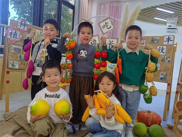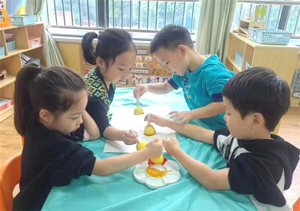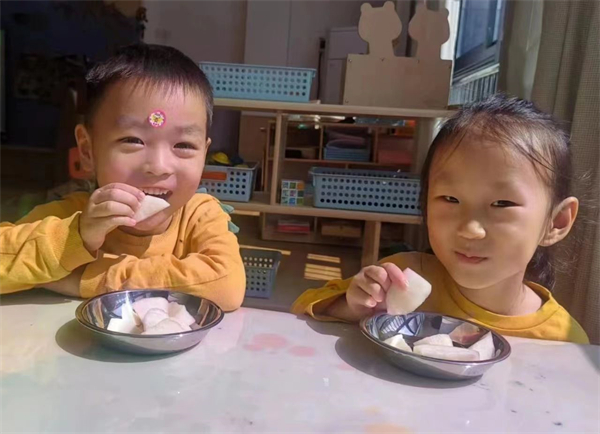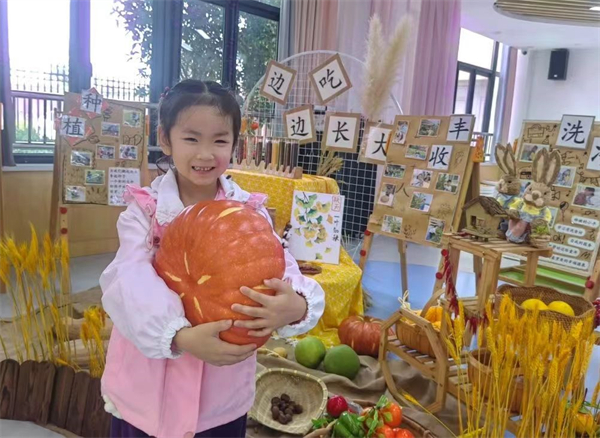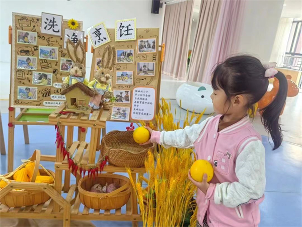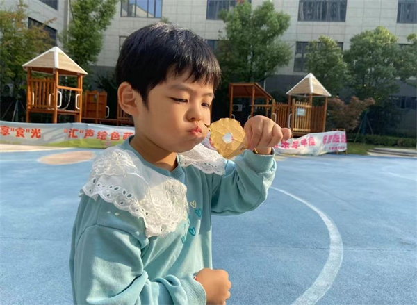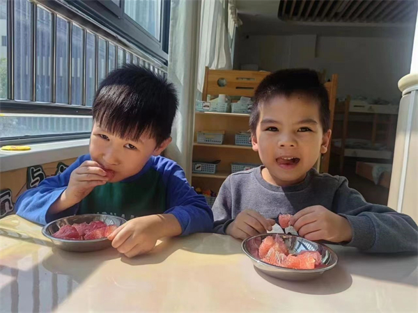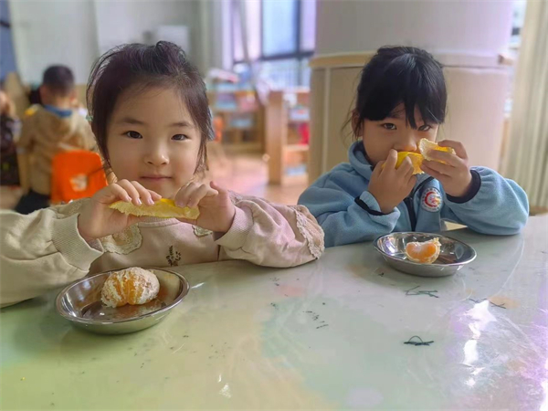 金秋十月,正是豐收的季節(jié)。融匯園根據(jù)季節(jié)特點(diǎn)選擇當(dāng)季新鮮的瓜果,一只只橘子、柚子和梨子等成為孩子們的餐點(diǎn)。