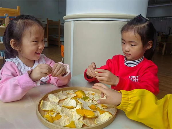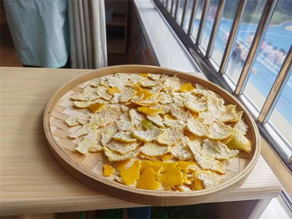 吃剩下來(lái)的果皮可不能浪費(fèi)了,孩子們將橘子皮收集起來(lái),裝進(jìn)籃子里,趁著天晴,他們把籃子放在太陽(yáng)下,曬起了橘皮……
