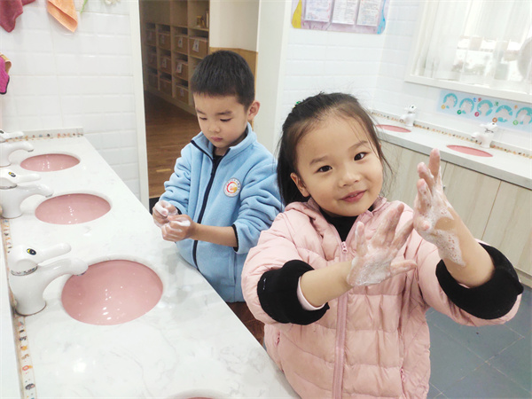 在一次戶外活動結(jié)束后,幼兒跟往常一樣在廁所里使用七步洗手法洗手,糖糖驚奇地說:“哇,你們看我手上有好多泡泡呀!其他幼兒看到后也把洗手液在手上使勁搓,弄出許多泡泡,這些泡泡真有趣呀!”