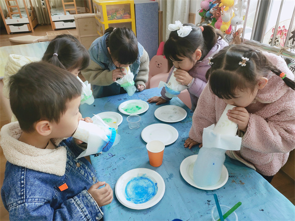 洗潔精和顏料相加,就變成了七彩泡泡,加綠色顏料,吹出的是綠色的泡泡,加藍色顏料吹出來的就是藍色的泡泡。快來看看我們吹出來的彩色泡泡龍吧!