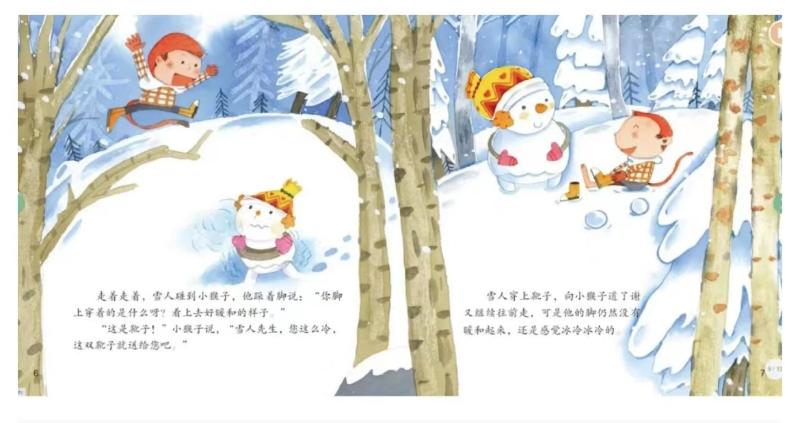 “每個孩子都喜歡雪,喜歡打雪仗、堆雪人……山上走下來一個雪人,他覺得很冷。于是,他向小兔子要了帽子,向小花貓要了手套,向小猴子要了靴子,向長頸鹿要了圍巾,可他依然覺得很冷。雪人走到一個小村莊,看到有個小姑娘在屋內烤火,于是敲開了小姑娘家的門,在壁爐前取暖…取著取著,雪人不見了?!?/font>