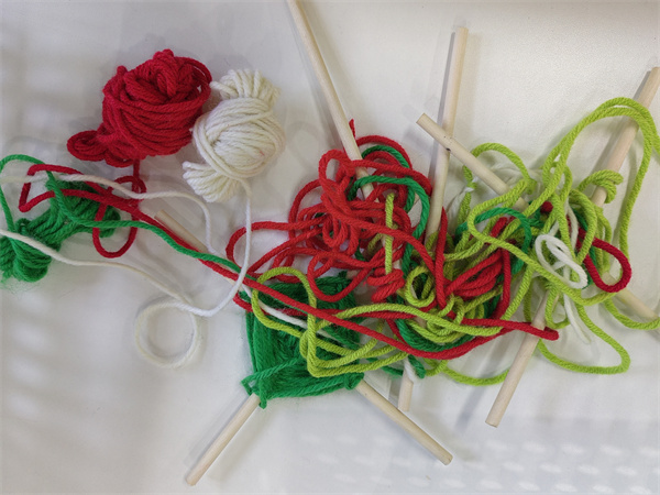 在曼達(dá)拉編織的基礎(chǔ)上小朋友們有了經(jīng)驗(yàn),現(xiàn)在將原有的兩根木棍增添至了三根木棍或者四根,將木棍頭拼接在一起形成了三角骨架后,再進(jìn)行編織。小朋友們認(rèn)真、有條理的編織手中的物品,編織的顏色也從單一的毛線,換成多種毛線,編織出了一條條獨(dú)特的小魚(yú)。