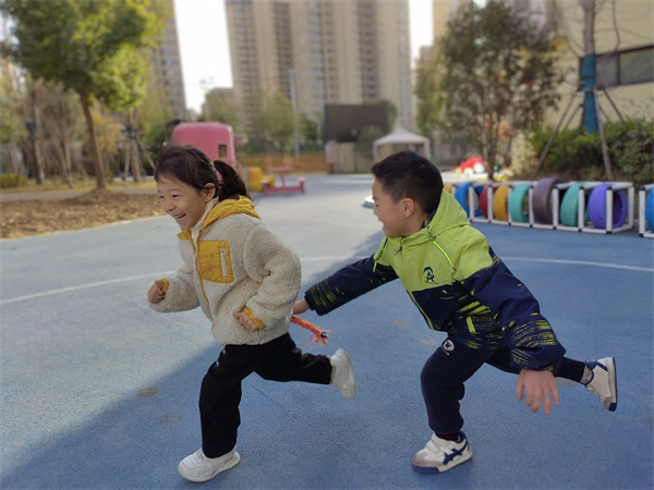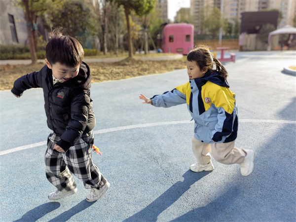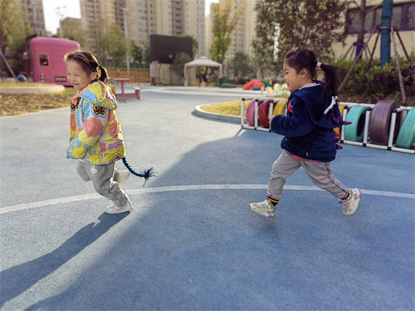 瞧,小朋友將自己編的麻花辮投入戶外活動(dòng),玩起了抓尾巴的游戲。