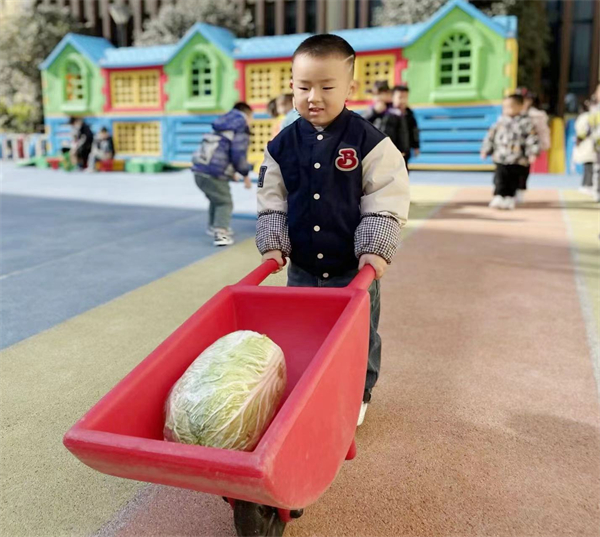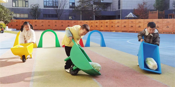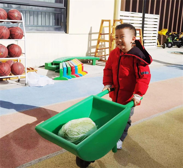 伴隨著哨聲,小班組的寶貝們開始了一場(chǎng)歡快精彩的運(yùn)輸大白菜比賽。