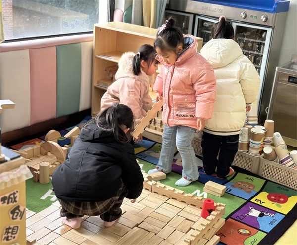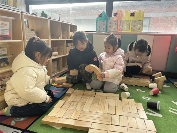 接著瑞儀、晨晨、景熙也拿著積木參與進來了,幾個小伙伴一邊商量一邊搭建,忙的不亦樂乎。沐希選擇長短、寬窄相同的木塊,一塊挨著一塊整齊、有序地平鋪在地面上,她和梓琪負責設計搭建,其他幾個孩子負責搬運。