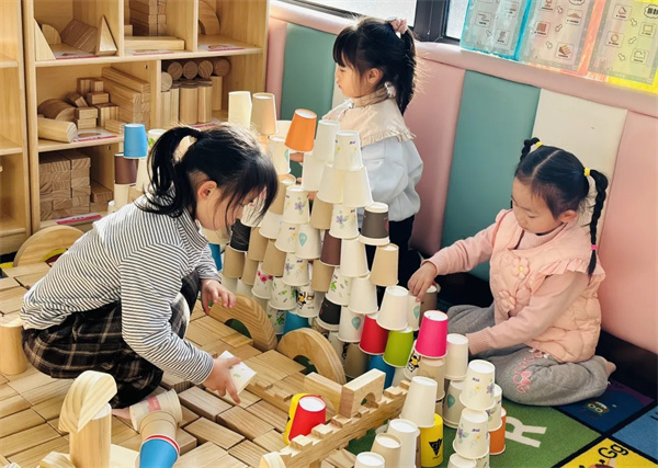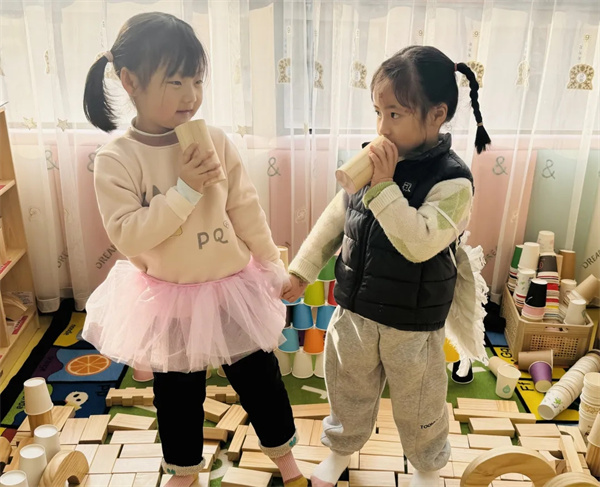 沐希提出用紙杯來搭建舞臺背景,啟發(fā)了小伙伴們使用多種材料進行搭建。在大家共同商量、交流中將作品設計得更加完美,向我們證明了兒童的學習和發(fā)展路徑是多元的。《指南》中社會領域人際交往目標2中提出:“對大家都喜歡的東西能輪流、分享?!薄盎顒訒r愿意接受同伴的意見和建議?!庇變涸谟螒蛑胁粻幉粨?,能與同伴分享,且在搭建時能虛心接受同伴的意見。