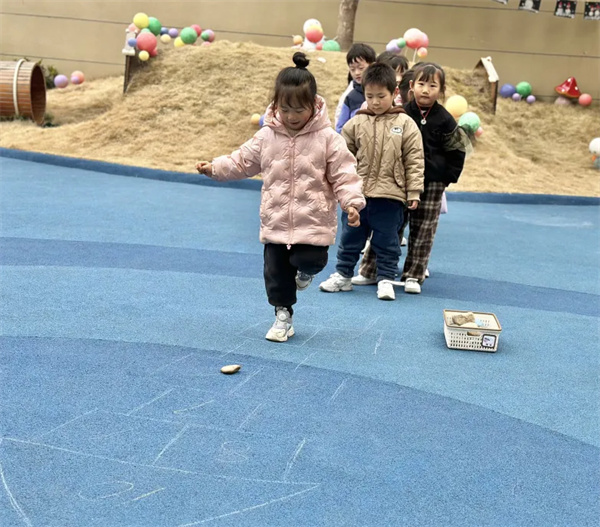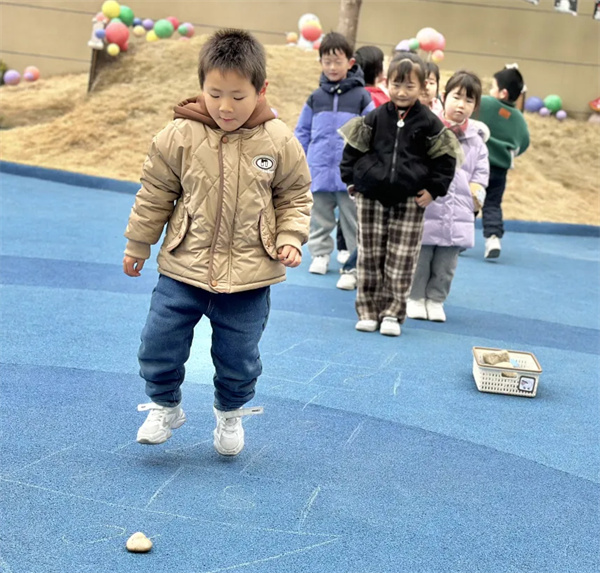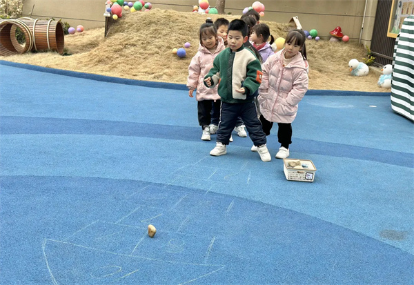 民間游戲具有易取材的特點(diǎn),在這次的跳房子游戲中,平時(shí)淘氣的個(gè)別幼兒也非常遵守規(guī)則,耐心等待,在游戲中孩子的合作意識(shí)、規(guī)則意識(shí)、前書寫能力、投擲能力、雙腳的協(xié)調(diào)能力都得到發(fā)展。