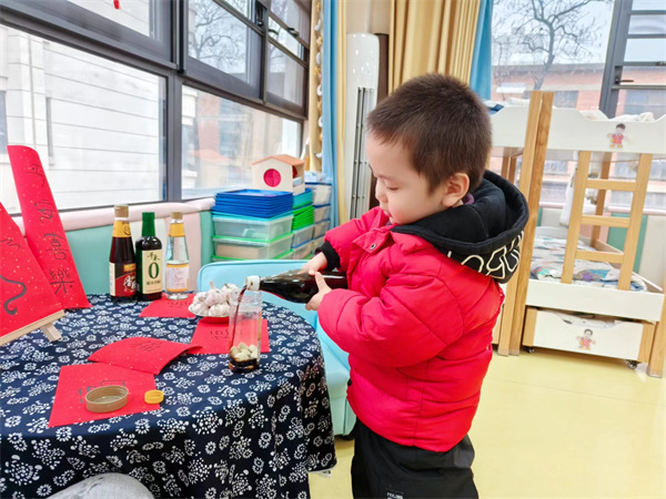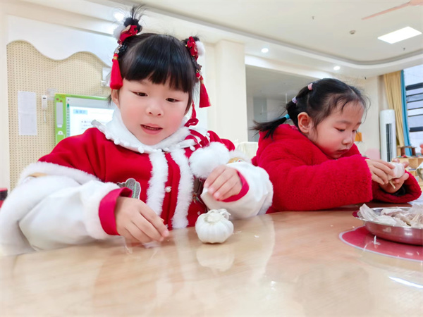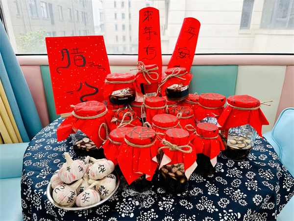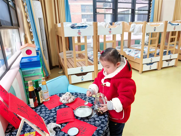 我國北方的大部分家庭還會在臘月初八這天有用醋泡蒜的習俗,叫臘八蒜。臘八蒜就是用醋來泡制大蒜瓣,其材料就是醋、大蒜瓣兒和白糖。臘八醋,要泡到大年初一,初一吃餃子,要吃素餃子,取一年素素凈凈之意,蘸臘八醋吃,別有一番滋味是。“臘八醋”不僅味道醇正,而且久放不壞。于是,小三班的小朋友們和老師一起腌制了一罐罐美味的臘八蒜!