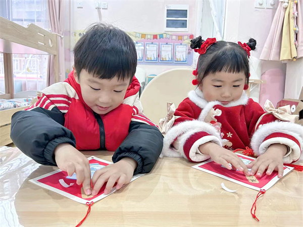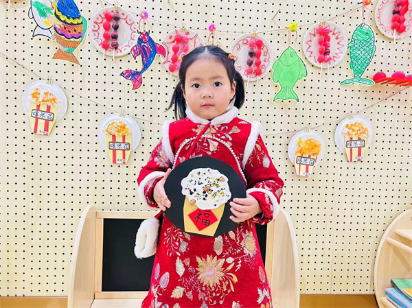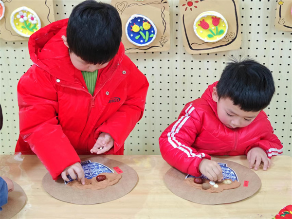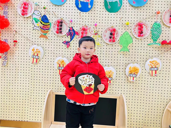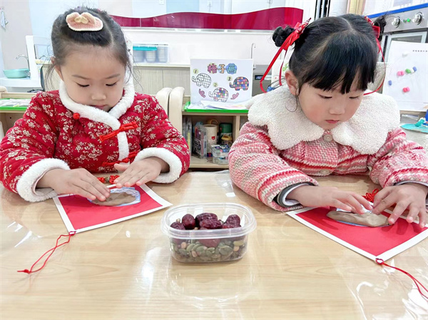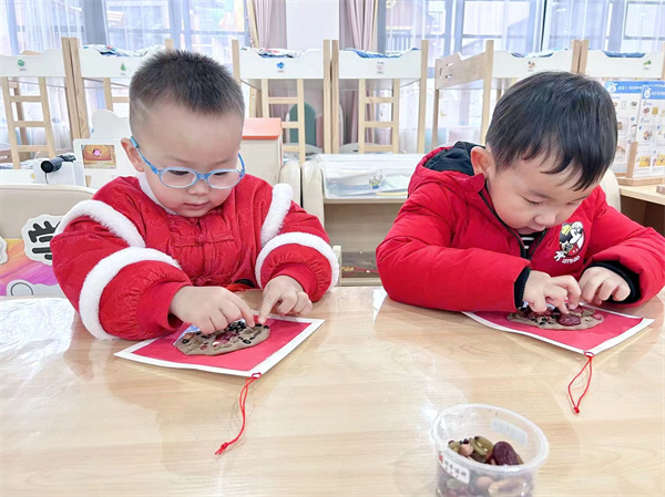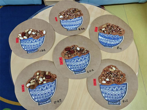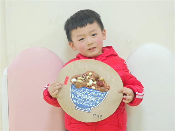 同時小朋友們也和老師動手動腦,利用各種豆子、卡紙和橡皮泥等材料制作了關(guān)于臘八粥的精美手工作品。