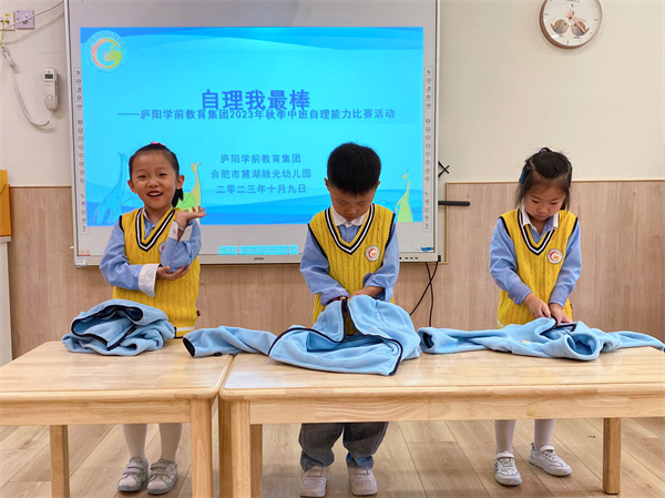 教育學家陳鶴琴說過:“凡是孩子能自己做的事情就該讓孩子自己做”。為了將幼兒生活習慣的培養(yǎng)融入教育教學工作中,提高生活自理能力,促進身體的協(xié)調(diào)性和靈活性發(fā)展,養(yǎng)成自己的事情自己做的良好習慣,2023年10月9日,合肥市麓湖融光幼兒園中二班進行了“自理我最棒”自理能力比賽活動。