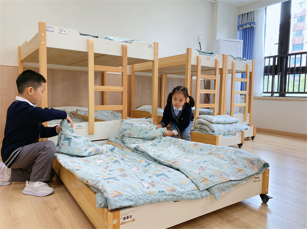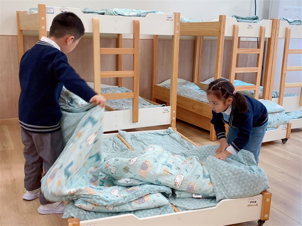 雖然比賽項目的難度升級,但是大家都絲毫不懼,牢記老師說過的疊被技巧:小被子,有長邊有短邊,拎著長邊對中間,點點頭,抬個腳,再把被子對折好。他們專心致志的沉浸在比賽中,這個環(huán)節(jié)同樣做得十分出色!