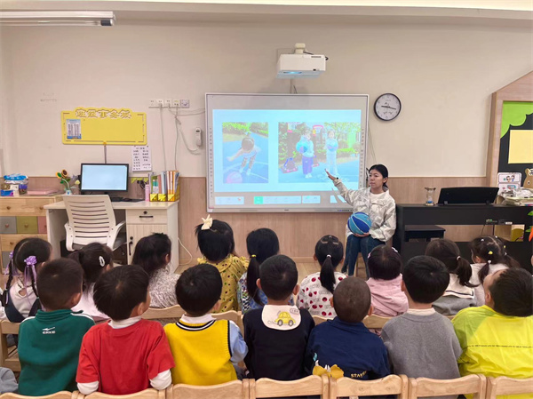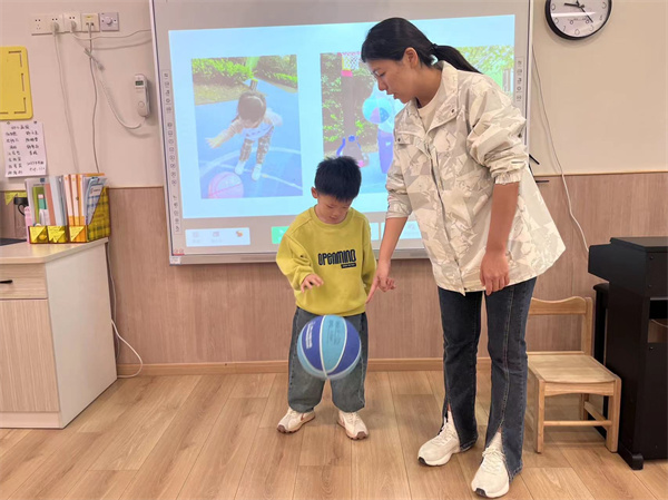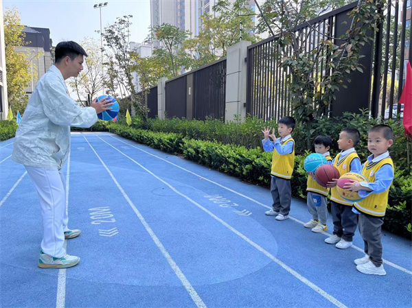 中班小朋友對籃球產(chǎn)生了濃厚的興趣,如何用小手去征服這個跳來跳去的“小精靈”呢?我們請來了體智能老師——朱老師來幫忙。