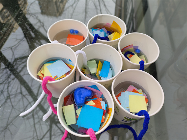 在老師的引導(dǎo)下,小朋友們準(zhǔn)備容器、放材料、倒入水,一起放在室外,等待冰花的盛開,神奇的旅程開始啦。