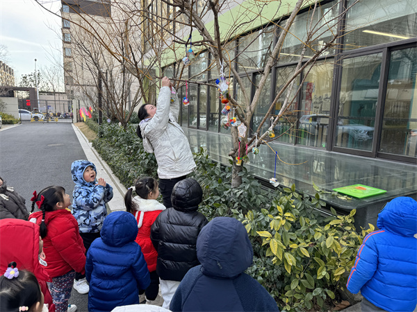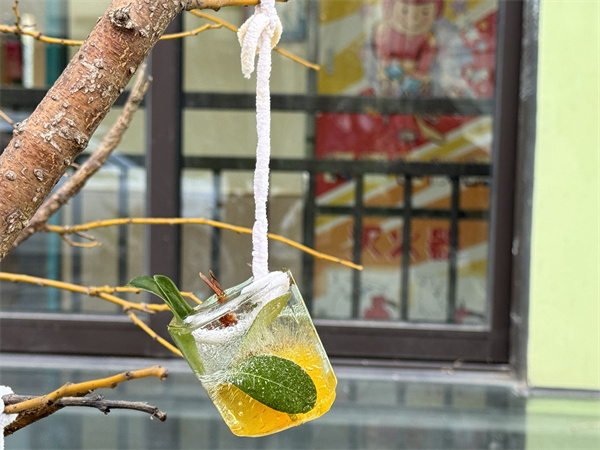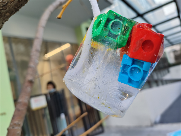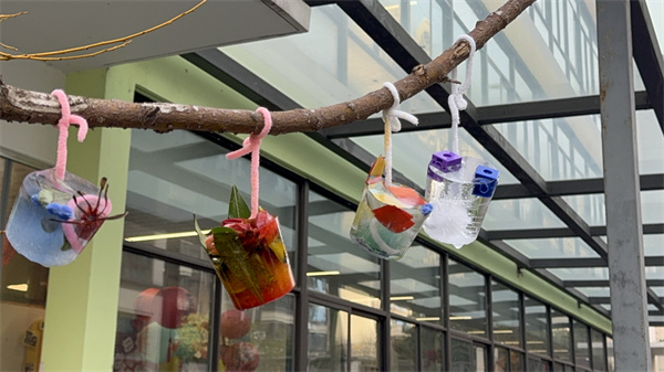經(jīng)過等待,我們的冰花成功啦!清早一來,我們便迫不及待地去觀察,哇!老師幫我們把冰花系在樹枝上,陽(yáng)光照射下的冰花更加晶瑩剔透,好美呀!我們一起去欣賞一下吧!