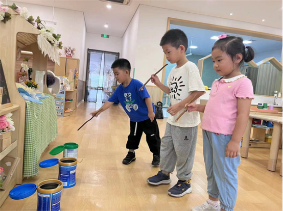 咦!瓶寶寶竟然會(huì)“唱歌”!沙沙沙,叮叮彭彭......原來(lái)是孩子們?cè)谔剿饔貌煌姆椒ㄗ屍孔影l(fā)出聲音,感受不同的瓶瓶罐罐發(fā)出的不同聲響,有的手拿瓶罐進(jìn)行敲打伴奏;有的用木棍敲擊瓶罐;還有的在瓶罐里裝入各種開(kāi)放性材料,通過(guò)搖晃使其發(fā)出聲響,一起來(lái)看看小小演奏家吧!