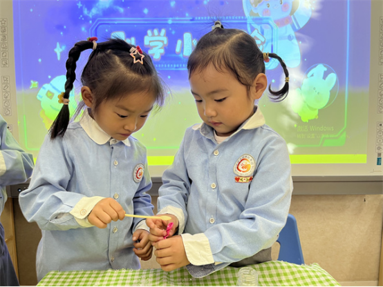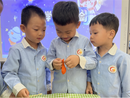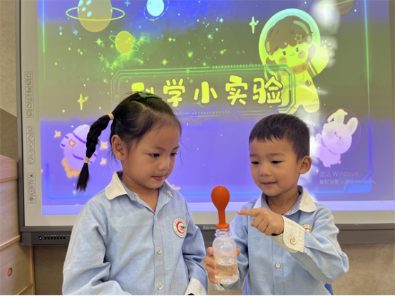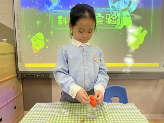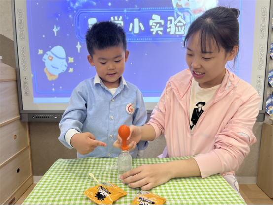 原來(lái),當(dāng)小蘇打和白醋混合在一起時(shí),會(huì)進(jìn)行快速反應(yīng)并生成二氧化碳,由于不斷進(jìn)行反應(yīng),使得二氧化碳?xì)怏w越來(lái)越多,逐漸被擠到氣球中,氣球逐漸被吹大。孩子們?cè)谟^看實(shí)驗(yàn)的過(guò)程中感受科學(xué)的神奇與魅力。