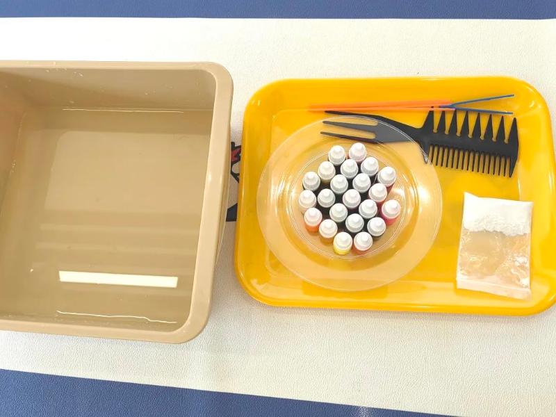1. 老師將畫粉與清水按比例混合,并將適量所得畫液倒入畫盆盆中,深度2厘米即可。