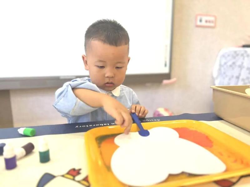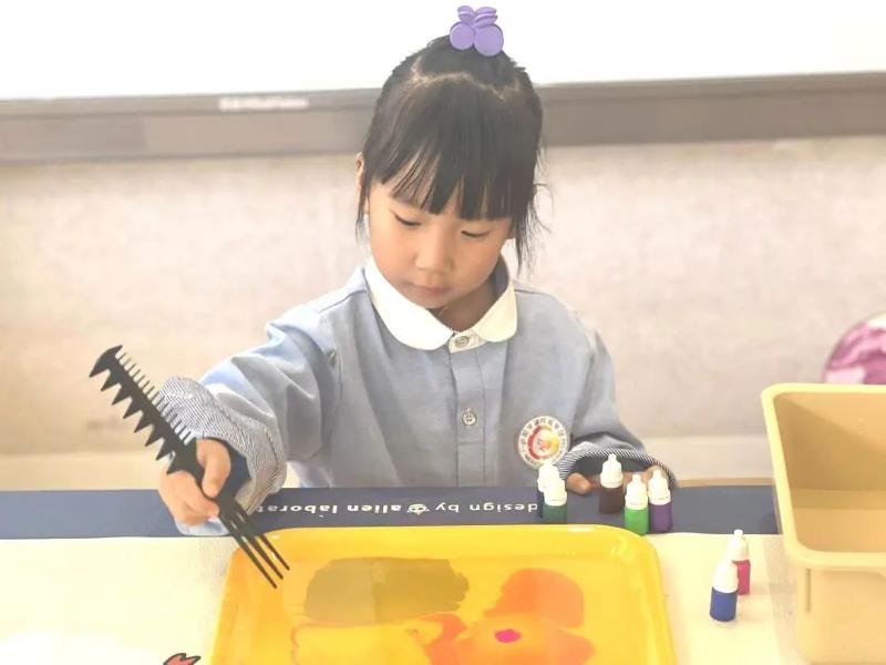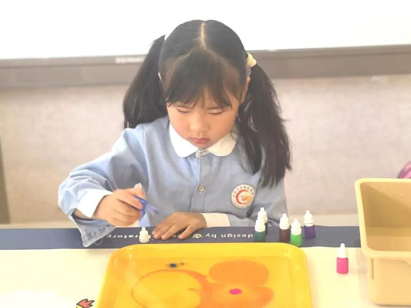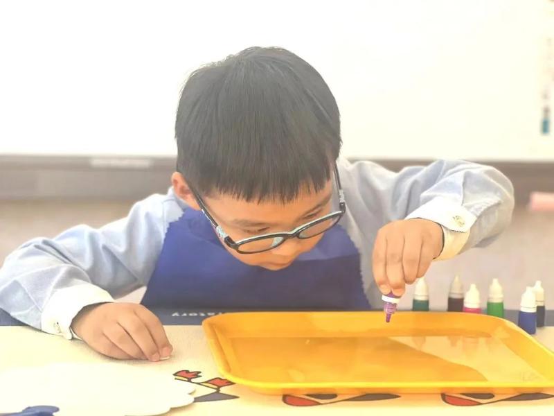 2. 幼兒將顏料在距離畫液2厘米左右高度滴入畫液中等待其擴散,擴散后可滴入其他顏料。