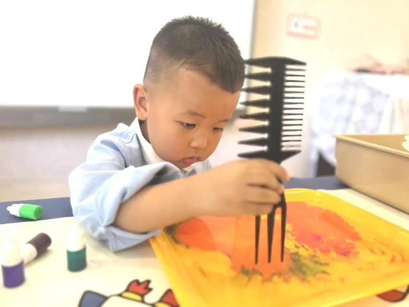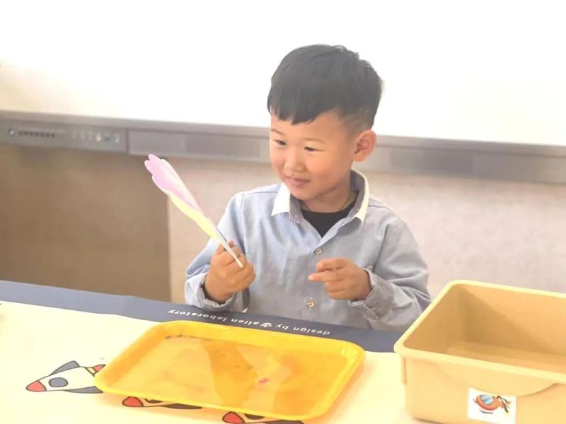 課前的準備自然是少不了的,為了讓孩子們真真切切感受水拓畫的魅力,老師帶著孩子們走進水中生花的世界,讓孩子能初步的感知水拓畫的神奇。