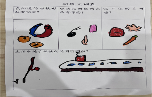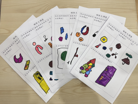 生活中有哪些東西是可以被吸住,哪些是不可以被吸住的呢?為了更好地總結(jié)經(jīng)驗,我們制作了一份《磁鐵大調(diào)查》,讓孩子和家長一起用圖文結(jié)合的形式將結(jié)果記錄下來。