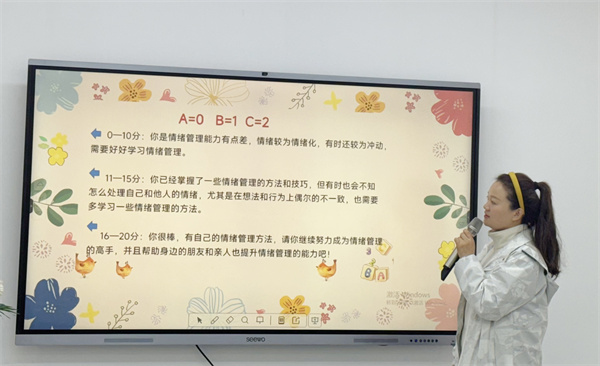 保健員馬文靜首先從心理學(xué)和教育學(xué)分析了幼兒教師現(xiàn)階段工作壓力及心理健康狀況,引導(dǎo)教師正確認(rèn)識(shí)自己的情緒,情緒會(huì)給我們的生活帶來(lái)什么變化。如何面對(duì)壓力管理情緒,使得老師們對(duì)于壓力有了更深入的了解,懂得了如何在工作和生活中正確調(diào)控自己的情緒。
