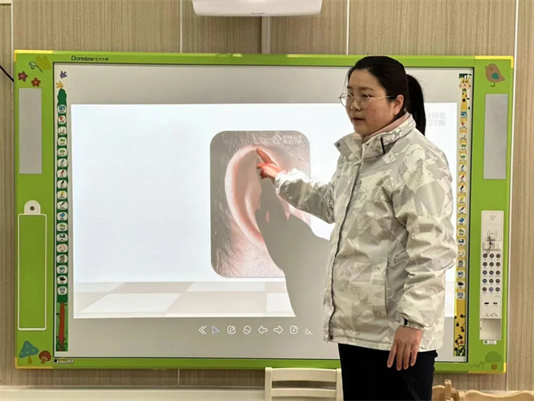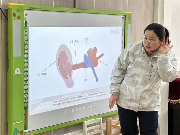 保健員老師們給小朋友們上了一節(jié)生動的“愛耳小課堂”,給大家介紹了耳朵的功能,并教給大家如何保護(hù)自己的小耳朵。