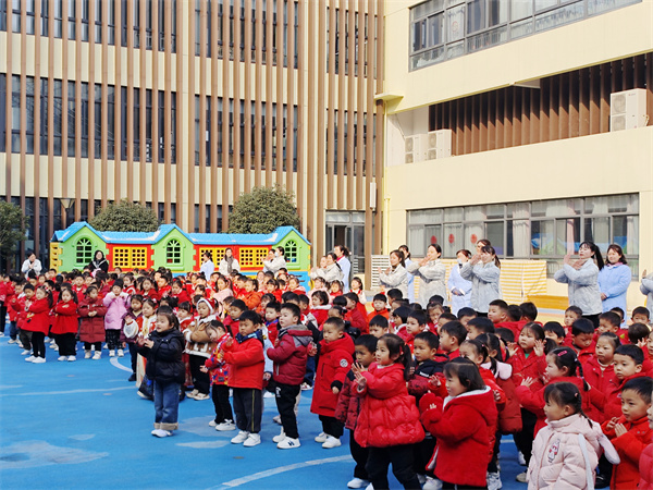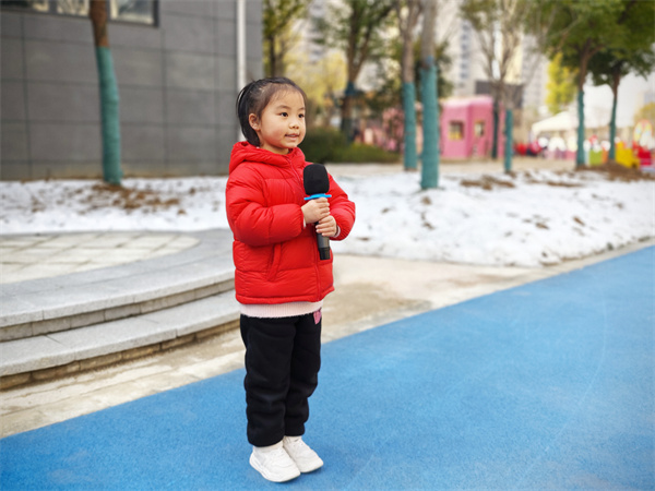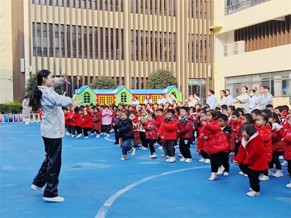 輕快的音樂響起,在教師戈怡的帶領(lǐng)下,全園教師與幼兒開始了熱身舞:《聽我說》。一舞結(jié)束,褪去全身的寒意,懷揣新夢(mèng)想,一路歡歌,一路前行。