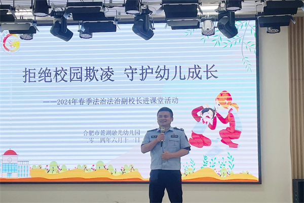 幼兒園是孩子們快樂成長(zhǎng)的地方,園所安全、孩子平安是老師和家長(zhǎng)朋友們的共同期盼。為維護(hù)幼兒身心健康,預(yù)防欺凌事件發(fā)生,增強(qiáng)幼兒的自律和防護(hù)意識(shí),2024年6月11日,合肥市麓湖融光幼兒園特邀請(qǐng)大楊鎮(zhèn)派出所民警兼法治副校長(zhǎng)吳俊龍走進(jìn)幼兒園,開展以“預(yù)防欺凌,呵護(hù)成長(zhǎng)”的校園防欺凌安全知識(shí)宣傳活動(dòng)。