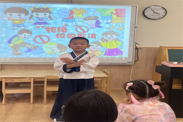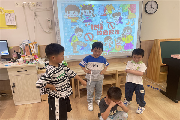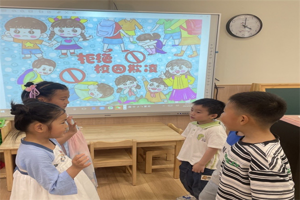 各班教師根據(jù)班級(jí)幼兒年齡特點(diǎn),結(jié)合孩子們?nèi)粘D苡龅降膯栴},利用觀看防欺凌視頻、情景演繹、游戲、繪本等多種方式,對(duì)幼兒進(jìn)行防欺凌安全教育,讓幼兒了解幼兒園欺凌及暴力行為的危害性,讓幼兒學(xué)會(huì)保護(hù)自己,勇敢地對(duì)欺凌行為說“不”,學(xué)會(huì)關(guān)愛身邊的人,成為有禮貌、能謙讓、講文明的好孩子。