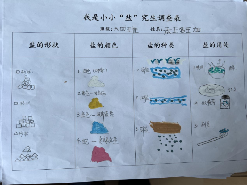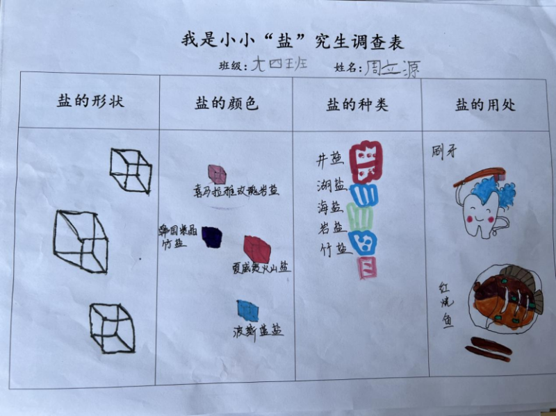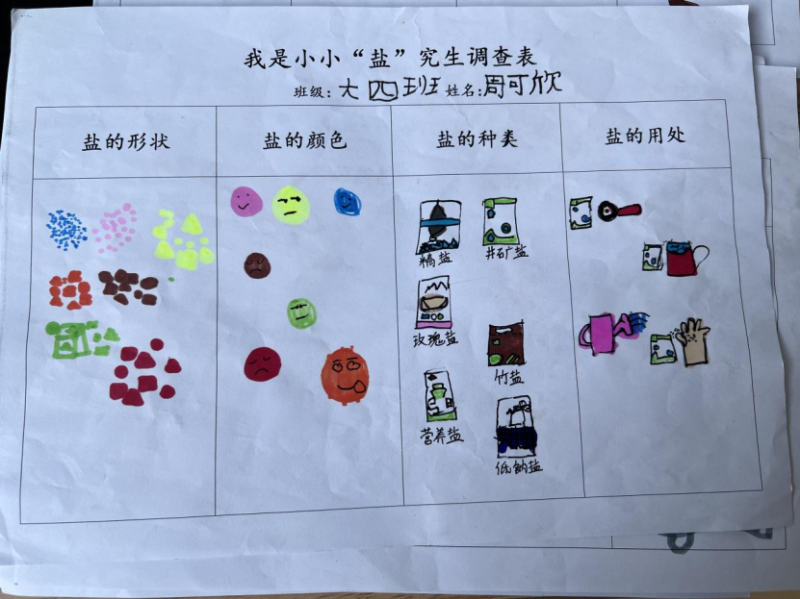 結(jié)合幼兒的問(wèn)題繪制了一張“關(guān)于鹽的調(diào)查表”。通過(guò)家園合作,引導(dǎo)他們針對(duì)鹽的不同作用等進(jìn)行調(diào)查。經(jīng)過(guò)了一番調(diào)查,孩子們迫不及待的想要分享一下自己發(fā)現(xiàn)。