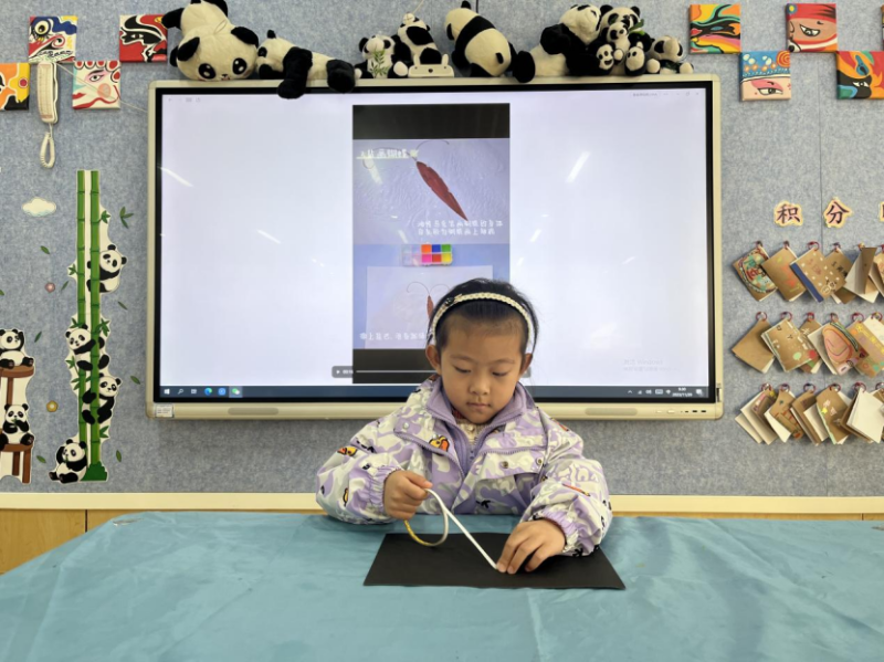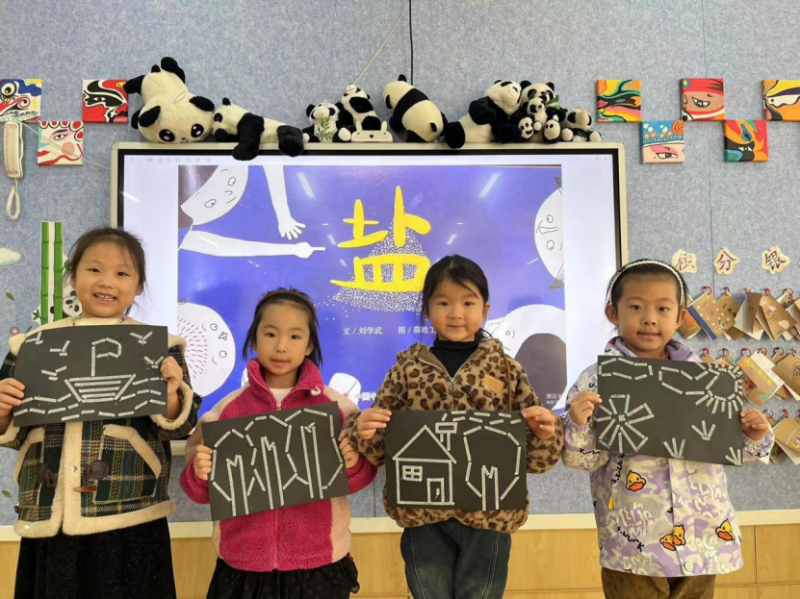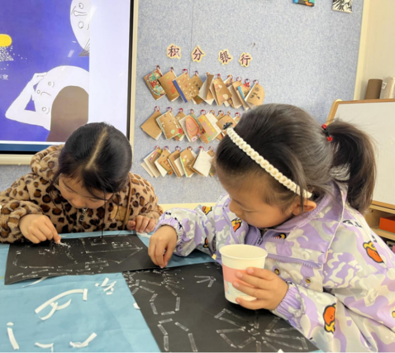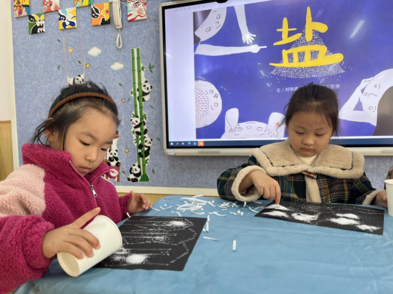 孩子們根據(jù)自己的想象在畫紙上粘上雙面膠,并在畫面上撒上鹽。就這樣一幅幅好看的鹽畫出現(xiàn)了。