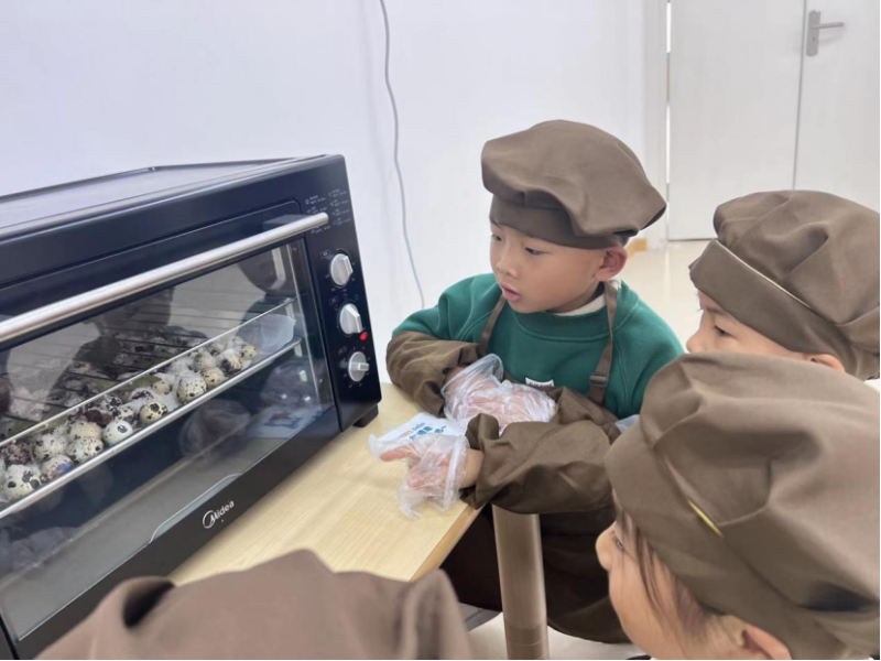 最終大家一致決定做鹽焗鵪鶉蛋。鵪鶉蛋洗凈,放入烤盤撒上鹽和調(diào)料,預(yù)熱烤箱,鵪鶉蛋烤至五分熟拿出,全部放入鐵鍋中燜熟。香噴噴的鹽焗鵪鶉蛋就出爐了。