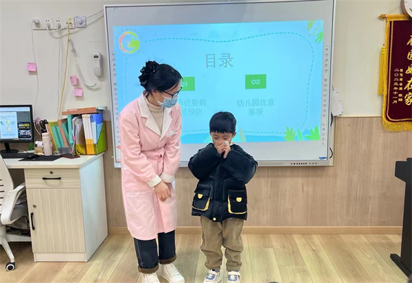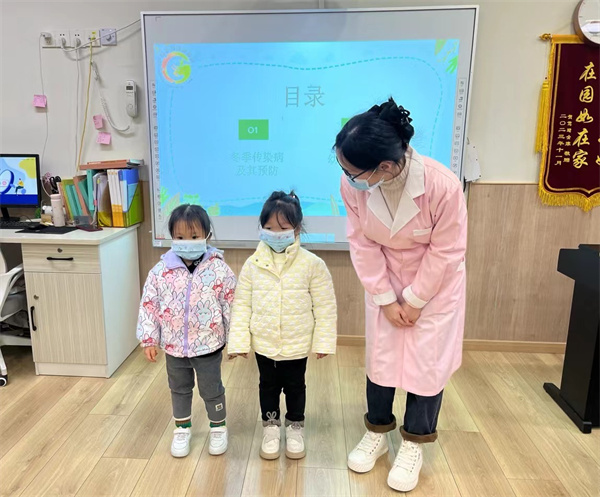 保健醫(yī)根據(jù)幼兒的年齡特點(diǎn),采用與幼兒互動(dòng)提問、PPT、情景模擬等方式,向幼兒介紹了冬季傳染病的病因傳播途徑及預(yù)防的方法,在課件和圖片的輔助下孩子們明白了秋冬季日常保健常識(shí)及各類傳染病的傳播途徑及預(yù)防措施。
