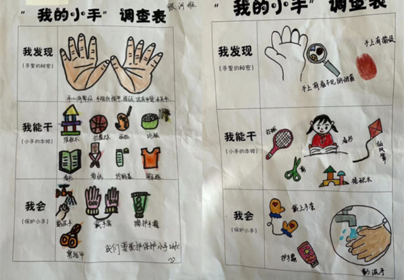 教師思考:通過本次調(diào)查,不僅使孩子們更深層的了解手的構(gòu)成,同時讓我們更加明確了現(xiàn)在是培養(yǎng)幼兒生活自理能力、動手能力的關(guān)鍵時期,要在幼兒心理種下幸福是由“雙手創(chuàng)造’的種子,逐步培育幼兒要養(yǎng)成勤于動手,巧用雙手的能力。