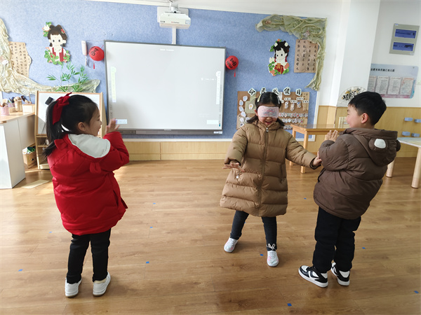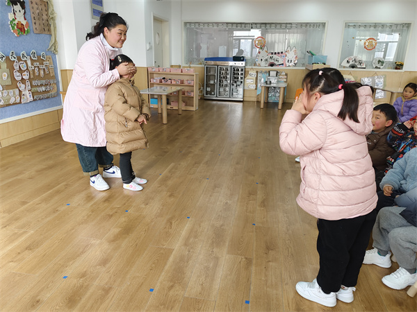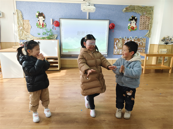 小耳朵很重要,讓我們一起來玩一玩“聽聲音辨方向”的游戲吧!兩名小朋友站在任意方位并發(fā)出聲音,一位小朋友用眼罩捂住眼睛,當聽到小朋友發(fā)出的聲音后就去尋找他們在哪里。通過這個游戲,小朋友可以更好的了解到耳朵的靈敏性。