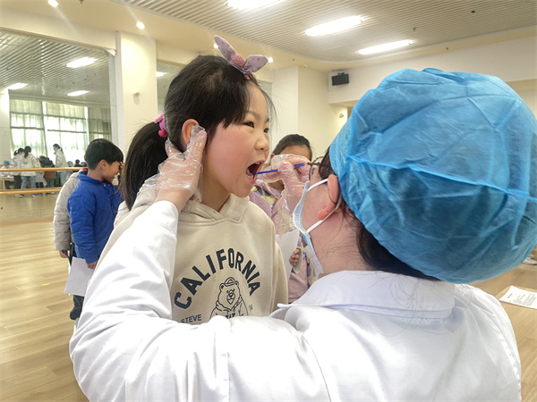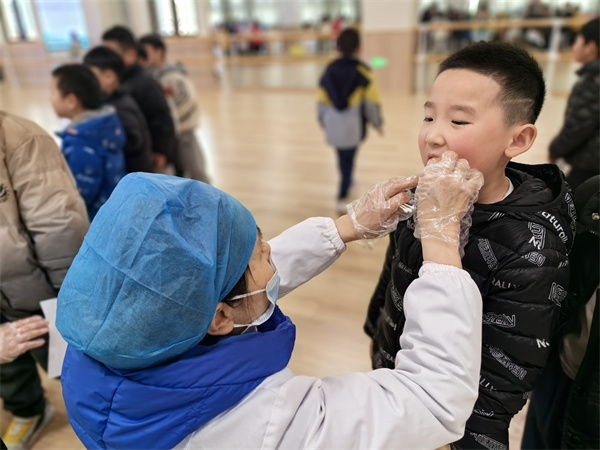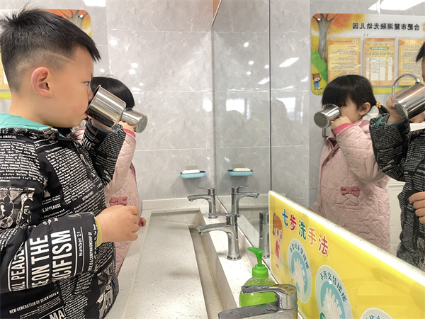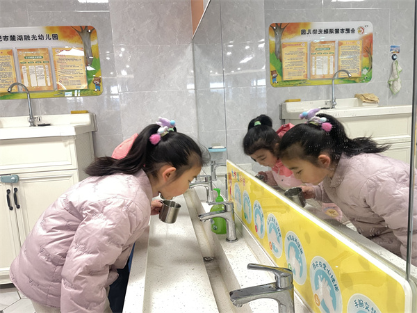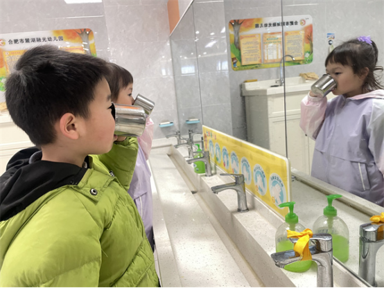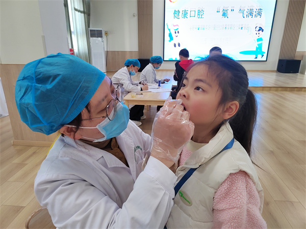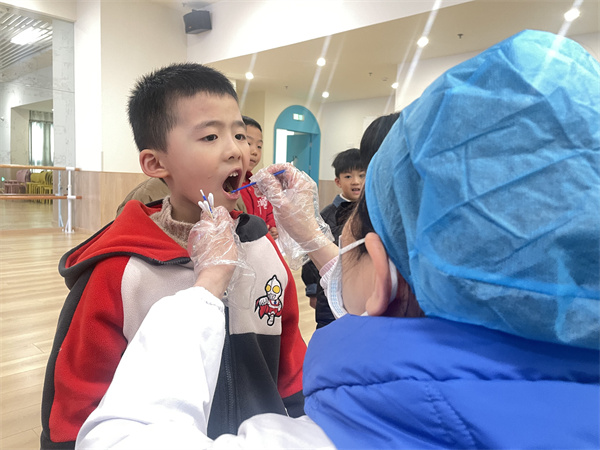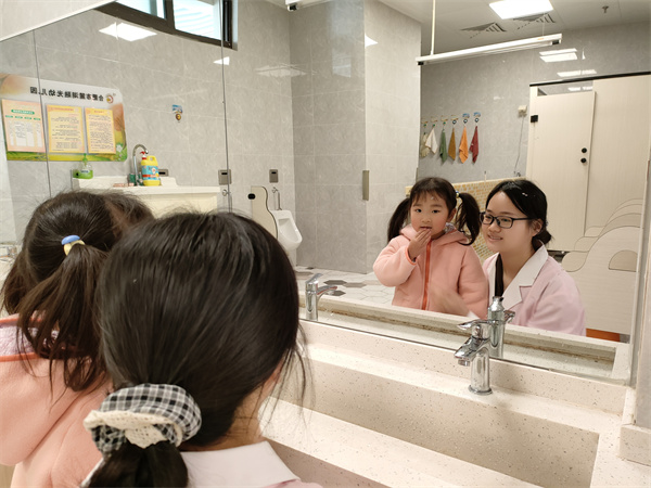 為了使涂氟效果最佳,教師帶領幼兒開展關于“牙齒涂氟”教育活動,并組織幼兒在涂氟前漱口清潔牙齒。