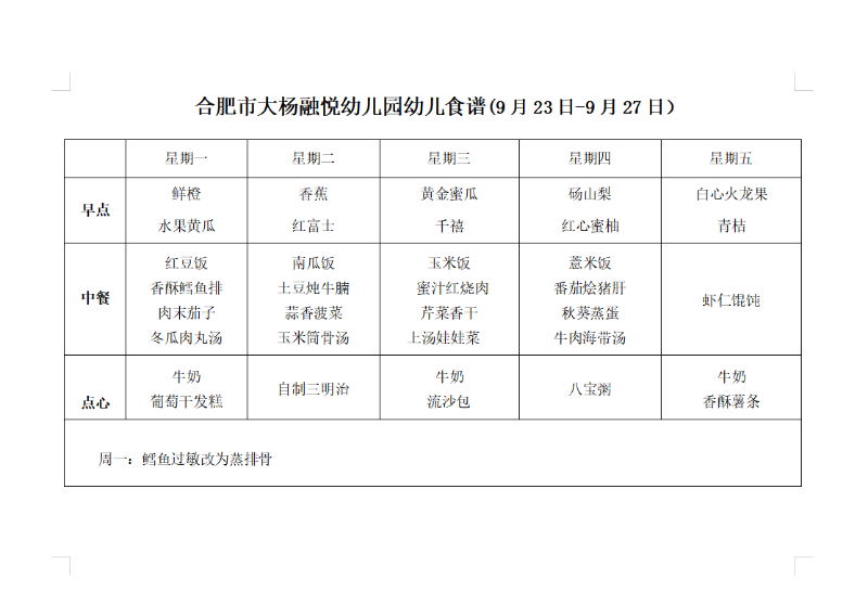 廬陽教育發(fā)展集團(tuán)2024年9月23日-9月27日幼兒食譜