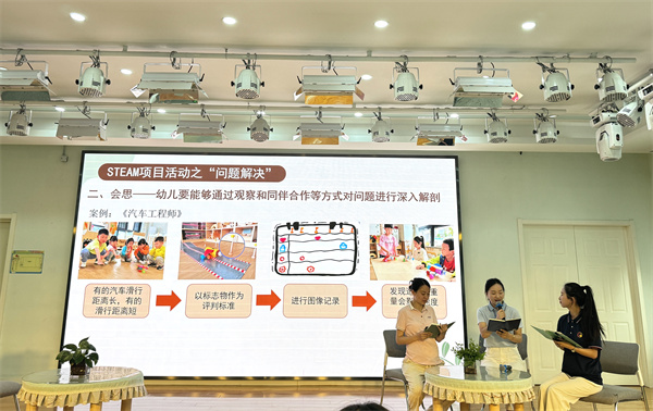 合肥市童興融暢幼兒園教師何雨婷與合肥市長(zhǎng)江路幼兒園杏林分園教師程麗、合肥市大西門(mén)幼兒園教師吳婷婷以自身案例為基礎(chǔ),談一談《STEAM教育項(xiàng)目活動(dòng)之問(wèn)題解決》。教師何雨婷圍繞“樂(lè)問(wèn)、會(huì)思、巧創(chuàng)、善言”四個(gè)方面,結(jié)合STEAM案例——《汽車工程師》,呈現(xiàn)了STEAM教育理念在問(wèn)題解決中的應(yīng)用與方法。