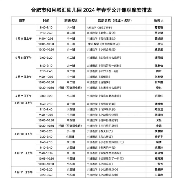 磨礪促成長(zhǎng),匠心譜芳華。為貫徹落實(shí)《3-6歲兒童學(xué)習(xí)與發(fā)展指南》精神,立足園本教研,進(jìn)一步加強(qiáng)幼兒園師資隊(duì)伍建設(shè),營(yíng)造濃厚教學(xué)氛圍,不斷促進(jìn)教師專業(yè)成長(zhǎng),切實(shí)提升教育教學(xué)質(zhì)量。根據(jù)教研計(jì)劃的實(shí)施安排,結(jié)合具體活動(dòng)方案與要求,2024年4月8日——4月11日,合肥市和月融匯幼兒園在執(zhí)行園長(zhǎng)楊開(kāi)君和業(yè)務(wù)負(fù)責(zé)趙曉艷的帶領(lǐng)下,開(kāi)展了為期一周的教師公開(kāi)課互聽(tīng)互評(píng)活動(dòng)。