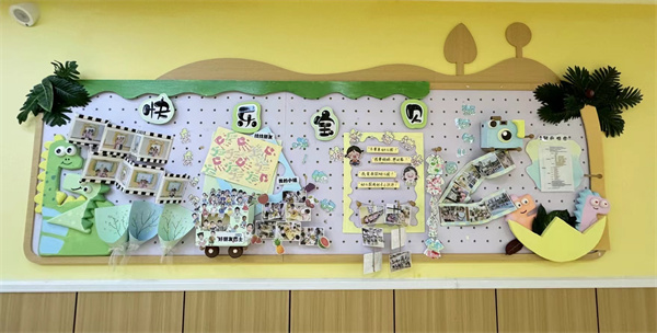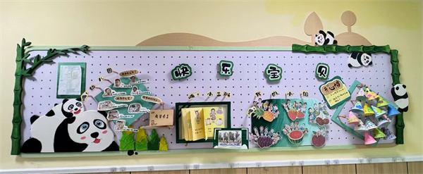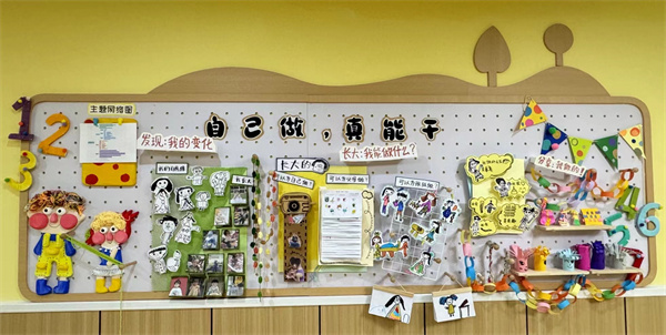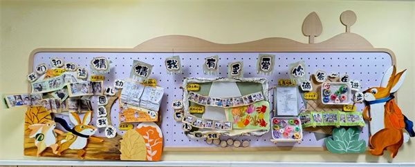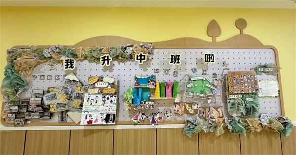中班幼兒好奇好問,喜歡思考探究、動(dòng)手操作。中班組教師提供多元的游戲材料支持幼兒探索世界,在與環(huán)境的互動(dòng)之中獲得成長(zhǎng)。每一處裝飾都是孩子喜歡的物品,每一件作品都是孩子的大作,用孩子的話、孩子的作品裝扮出了會(huì)說話的墻面。