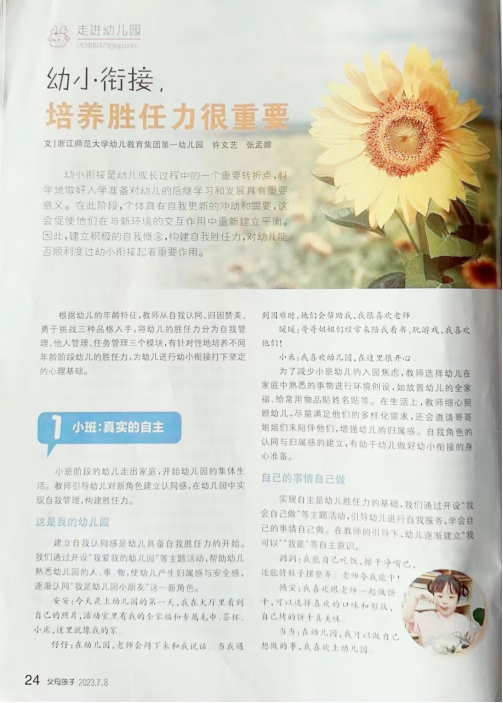 在蘇蕊主任的帶領(lǐng)下,全體教師通過輪流的方式共讀了2023年7月《幼兒教育》中走進(jìn)幼兒園欄目的文章《幼小銜接,培養(yǎng)勝任力很重要》。文章指出,幼小銜接是幼兒成長過程中的一個(gè)重要轉(zhuǎn)折點(diǎn),科學(xué)做好入學(xué)準(zhǔn)備對(duì)幼兒的后繼學(xué)習(xí)和發(fā)展具有重要意義。在此階段,個(gè)體具有自我更新的沖動(dòng)和需要,這會(huì)促使幼兒在與新環(huán)境的交互作用中重新建立平衡。因此,建立積極的自我概念,構(gòu)建自我勝任力,對(duì)幼兒能否順利度過幼小銜接起著重要作用。