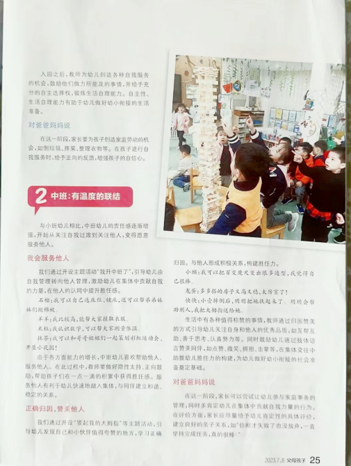 在中班階段,家長可以嘗試讓幼兒參與家庭事務(wù)的管理,同時(shí)多肯定幼兒在集體中貢獻(xiàn)自我力量的行為。在評(píng)價(jià)方面,家長應(yīng)盡量給予幼兒肯定性的具體評(píng)價(jià),建立良好的親子關(guān)系,如“你剛才失敗了也沒放棄,一直堅(jiān)持完成任務(wù),真的很棒!