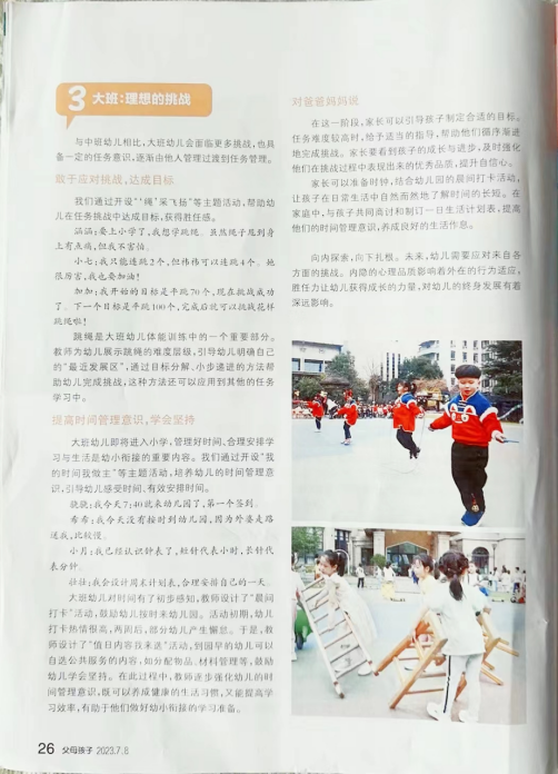 在大班階段,家長可以引導(dǎo)孩子制定合適的目標(biāo)。任務(wù)難度較高時(shí),給予適當(dāng)?shù)闹笇?dǎo),幫助他們循序漸進(jìn)地完成挑戰(zhàn)。家長要看到孩子的成長與進(jìn)步,及時(shí)強(qiáng)化他們?cè)谔魬?zhàn)過程中表現(xiàn)出來的優(yōu)秀品質(zhì),提升自信心。家長可以準(zhǔn)備時(shí)鐘,結(jié)合幼兒園的晨間打卡活動(dòng),讓孩子在日常生活中自然而然地了解時(shí)間的長短。在家庭中,與孩子共同商討和制訂一日生活計(jì)劃表,提高他們的時(shí)間管理意識(shí),養(yǎng)成良好的生活作息。