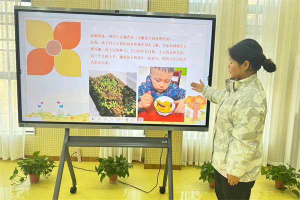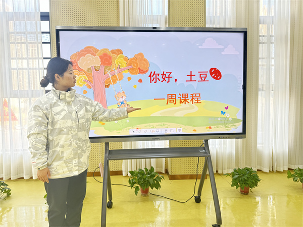 小二班教師劉慧分享的是課程是《你好,土豆》課程起源是在植物區(qū)觀察水培的植物時(shí),幼兒對(duì)土豆的很感興趣。“我昨天就吃了土豆絲”“薯?xiàng)l就是用土豆做的”,幼兒經(jīng)過(guò)了一番議論,一場(chǎng)土豆的奇妙之旅展開(kāi)了。根據(jù)幼兒對(duì)土豆好奇心,從認(rèn)識(shí)土豆開(kāi)展了五大領(lǐng)域的活動(dòng),并根據(jù)幼兒的興趣不同展開(kāi)了區(qū)域游戲活動(dòng)。