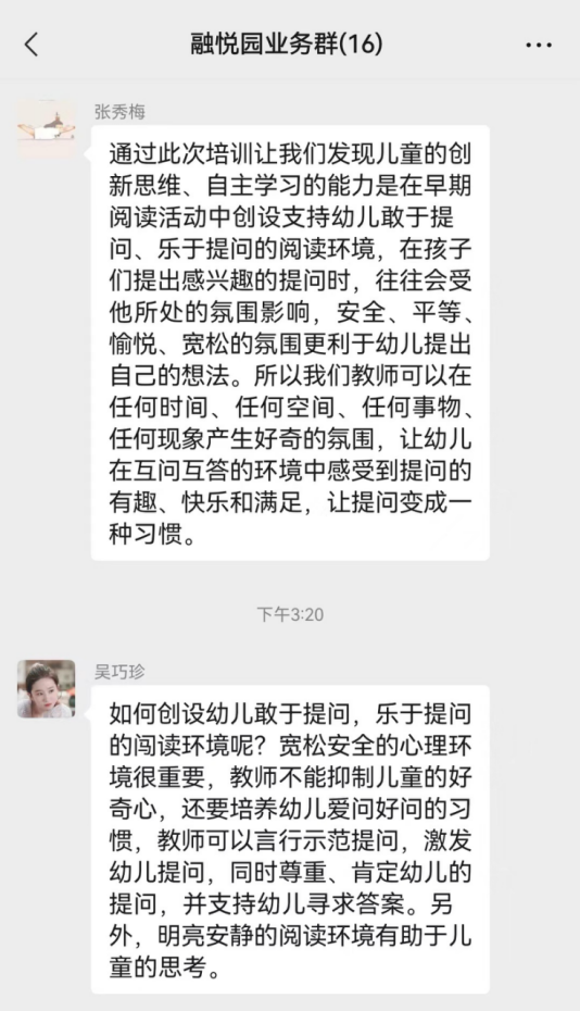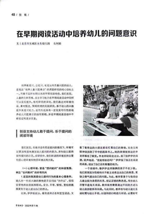 基于幼兒興趣,在早起閱讀中為提升幼兒?jiǎn)栴}能力,在業(yè)務(wù)負(fù)責(zé)董欣顥的帶領(lǐng)下,全體教師共學(xué)了期刊《學(xué)前教育》--《在早期閱讀活動(dòng)中培養(yǎng)幼兒的問(wèn)題意識(shí)》一文,進(jìn)行幼兒“悅+閱讀”培養(yǎng)幼兒?jiǎn)栴}意識(shí)路徑的探究。