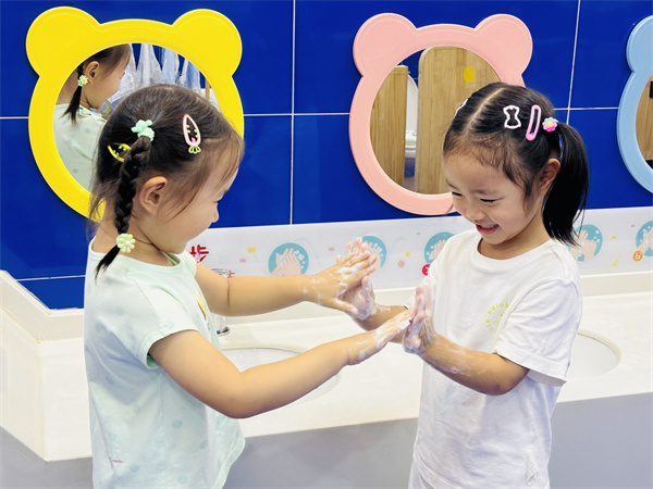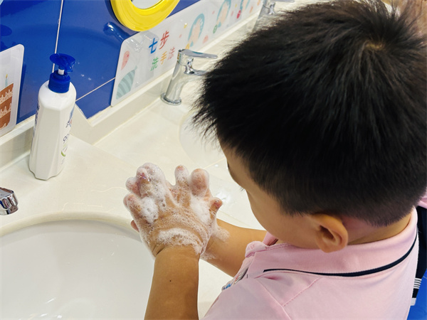 近期,我經(jīng)常發(fā)現(xiàn)孩子們?cè)陬孪吹臅r(shí)間比較久,悄悄走近一看,他們正在搓泡泡,并且很開(kāi)心的相互分享:“哇,你看,我的手上有泡泡”,“我的手上也有泡泡,還有很大的泡泡?!?,原來(lái)是手上的泡泡讓他們產(chǎn)生了興趣。