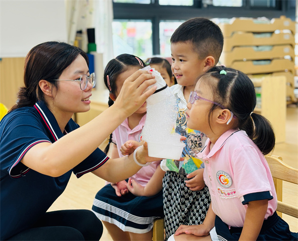 孩子們假期歸來(lái),迫不及待地和老師還有伙伴們分享自己假期在家玩泡泡的經(jīng)歷。那么,我們將繼續(xù)探究:在班級(jí)里沒(méi)有泡泡水的情況下該怎么玩泡泡呢?